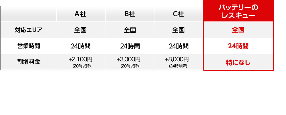 使用いたしますバッテリーのレスキューは全国統一の料金をご準備しております。地域や時間帯によって不正確に高額になることはございません。